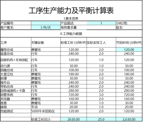 平衡率=【單件標準時間總和÷(瓶頸時間X工位總數)】×100%==2630 ÷(720X15)X100%=24.35%。