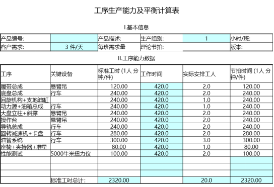 平衡率=【單件標準時間總和÷(瓶頸時間X工位總數)】×100%== 2320 ÷(300X11)X100%=70.30%