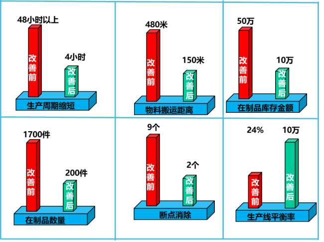 “如果你不能迅速把產品開發時間減半、訂貨時間減少70%、生產周期縮減90%,那你一定是哪兒做錯了”。因此,為了縮短生產周期,車間以組建生產線、工序間改善為抓手,著力實現生產周期優化。通過打破班組間壁壘,再造生產組織,整合4個班組到1個班組,將10個生產工序拉成新的生產線,降低產線瓶頸工序時間,消除過程等待浪費。產線重組消除了從下料到裝配搬運浪費,單件周轉距離從480米減少至150米,周轉次數由6次降為1次,斷點9個降為2個,生產周期從48小時降至4小時。